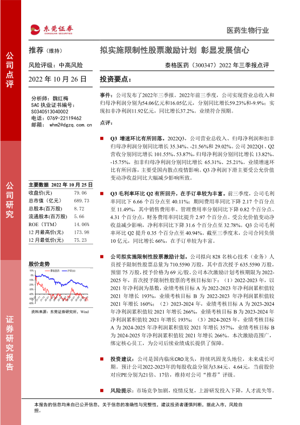 本报告对泰格医药2022年三季报进行了点评,分析了公司业绩、盈利能力、股权激励计划,并给出了投资建议和风险提示。报告指出,公司业绩符合预期,但增速有所回落,股权激励计划彰显了公司对未来发展的信心。维持“推荐”评级,但需关注市场竞争、疫情、研发投入和人才流失等风险。