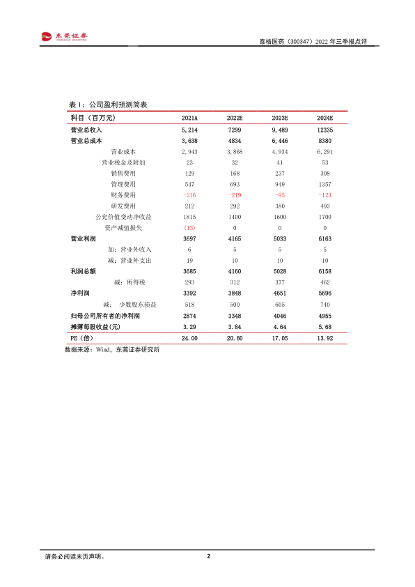 Q3 增速环比有所回落。 2022Q3,公司营业总收入、归母净利润和扣非归母净利润分别同比增长 35.34%、 -21.56%和 29.02%。公司 2022Q1、 Q2营收分别同比增长 101.55%、 53.87%,归母净利润分别同比增长 13.82%、-15.75%,扣非归母净利润分别同比增长 65.31%、 25.21%。业绩增速环比有所回落,主要受国内散点疫情影响。 Q3 净利润下滑主要受公允价值变动净收益同比大幅减少影响所致。