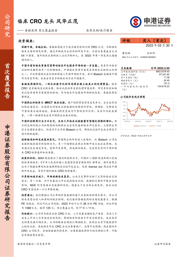 投资建议:我们根据公司公布的财务数据和每个业务板块的增长潜力,对公司的未来营业收入和净利润做出预测。我们看好泰格医药的长期发展潜力,根据PE估值法,对比可比公司均值,2023年给予公司38倍的PE估值,对应市值为1088亿元,股价125元。首次覆盖公司,给予“买入”评级。