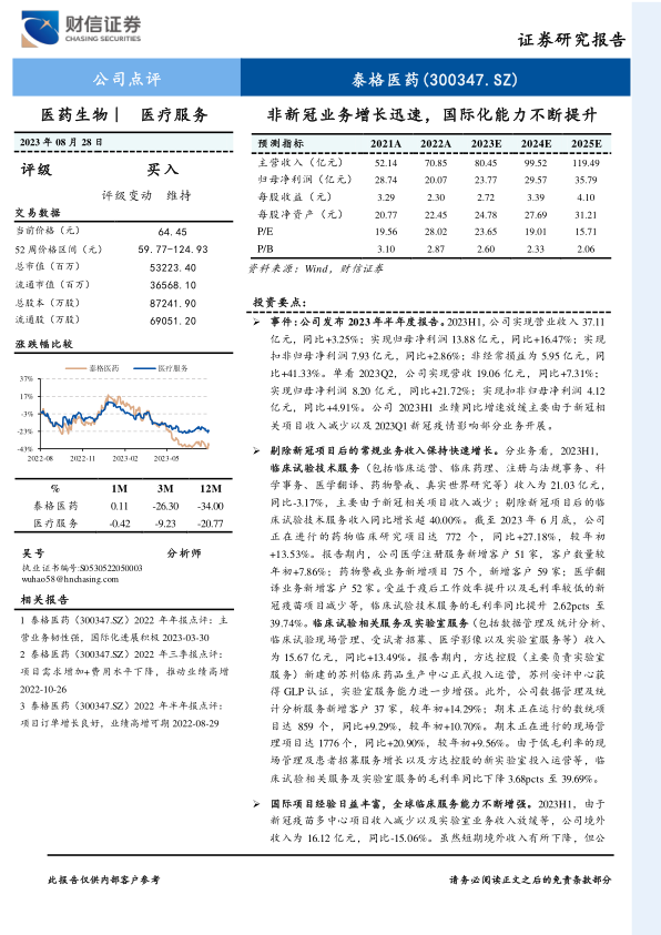 盈利预测与投资建议:2023-2025年,预计公司实现归母净利润23.77/29.57/35.79亿元,EPS分别为2.72/3.39/4.10元,当前股价对应的PE分别为23.65/19.01/15.71倍。公司估值方面,由于公司股权投资产生的非经常损益金额大(2022年产生非经常性损益4.67亿元)、不确定性高,我们将公司业务拆分为投资业务与临床CRO主营业务进行估值。投资业务部分,截止2023年6月底,公司其他非流动金融资产、长期股权投资的账面余额分别为106.09、24.14亿元,考虑到当前医药生物企业二级市场表现、一级市场融资不佳,基于谨慎性原则,我们以账面余额作为公司投资业务的估值,即投资业务对应的估值为130.23亿元。临床CRO主营业务,预计2023年实现扣非归母净利润17.19亿元,同比增长11.66%(剔除新冠相关项目后的业绩增速预计在30.00%左右),参考公司业绩增速、公司历史估值、同业公司估值,给予临床CRO业务2023年30-35倍PE,该业务对应的估值为515.70-601.65亿元。综合来看,公司2023年的合理市值为645.93-731.88亿元,对应的目标价格为74.07-83.93元/股,维持公司“买入”评级。