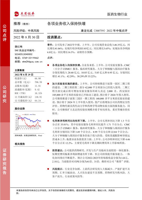 康龙化成2022年中报显示各项业务收入保持快速增长,业绩符合预期。公司通过加大实验室建设,不断提升服务能力。虽然短期内受费用影响净利润增速有所下降,但维持“推荐”评级。投资者应关注行业竞争、研发投入、产能扩建、汇率波动、人才建设、研发风险、客户流失及政策变化等风险因素。
