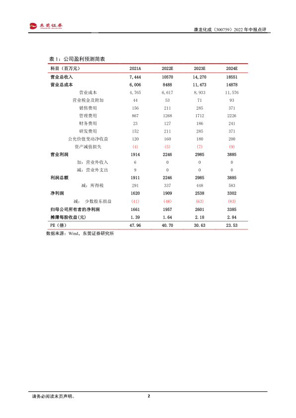 投资建议: 公司提供药物研究、开发与生产及临床全流程的一体化服务。短期受费用拖累净利润增速有所下降,但公司持续提升服务能力,一体化协同效应不断提升。预计公司2022-2023年的每股收益分别为1.64元、2.18元,当前股价对应PE分别为41倍、31倍,维持对公司“推荐”评级。