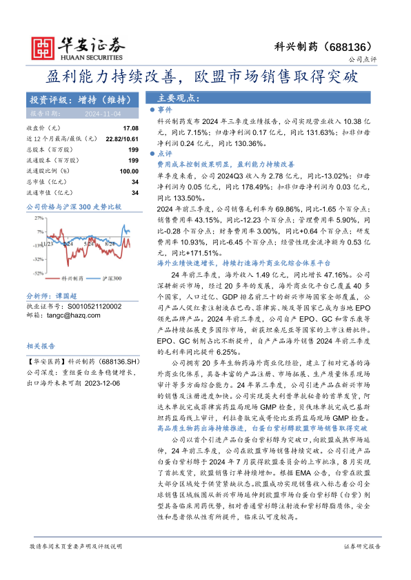 科兴制药在2024年三季度通过有效的成本控制和费用管理,实现了盈利能力的显著提升。同时,公司在海外市场取得了重要突破,特别是在欧盟市场的销售进展顺利,为未来的增长奠定了基础。尽管国内市场受到集采政策的影响,但公司通过拓展海外市场和优化产品结构,有望实现持续增长。维持“增持”评级,看好公司高品质生物药出海的长期发展潜力。