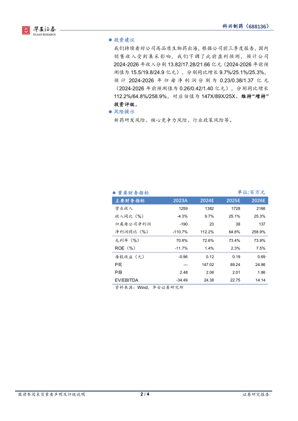 我们持续看好公司高品质生物药出海,根据公司前三季度报告,国内销售收入受到集采影响,我们下调了此前盈利预测,预计公司2024-2026年收入分别13.82/17.28/21.66亿元(2024-2026年前预测值为15.5/19.8/24.9亿元),分别同比增长9.7%/25.1%/25.3%,预计2024-2026年归母净利润分别为0.23/0.38/1.37亿元(2024-2026年前预测值为0.26/0.42/1.40亿元),分别同比增长112.2%/64.8%/258.9%,对应估值为147X/89X/25X。维持“增持”投资评级。