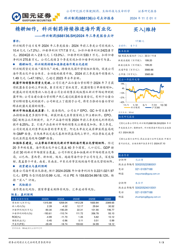 国元证券维持对科兴制药的“买入”评级。随着公司海外商业化进程的持续推进,分析师预计2024年至2026年归母净利润将分别达到0.22亿元、1.02亿元和1.97亿元,对应每股收益(EPS)分别为0.11元、0.51元和0.99元。相应的市盈率(PE)预测为159.83倍、34.99倍和18.12倍,反映出随着盈利能力的快速恢复和增长,估值将逐步回归合理水平。