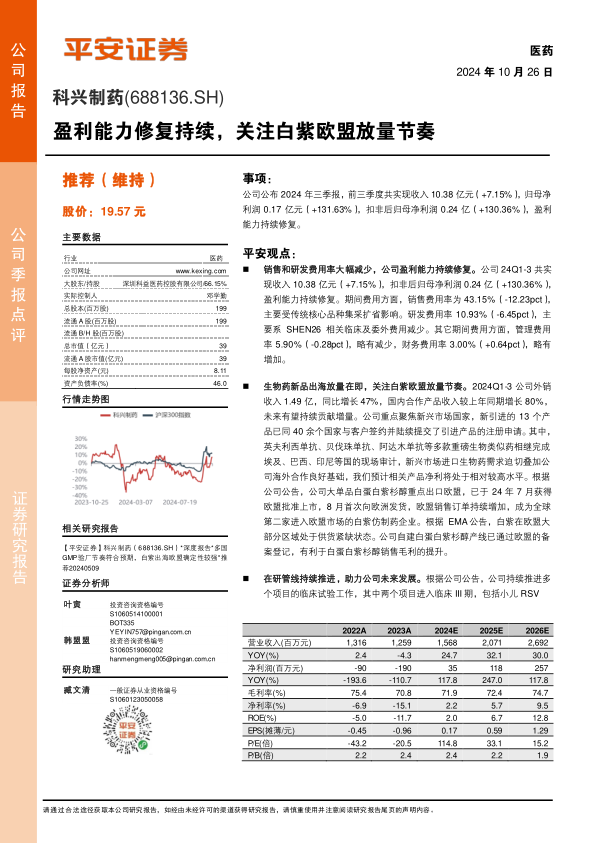 本报告分析了科兴制药2024年三季报,指出公司盈利能力持续修复,主要得益于销售和研发费用率的有效控制。公司积极拓展海外市场,尤其是白蛋白紫杉醇在欧盟的获批上市,有望成为新的增长点。此外,公司研发管线稳步推进,为未来发展提供动力。维持对公司“推荐”评级,但同时也提示了研发进度、海外商业化进度以及行业政策变化等风险。