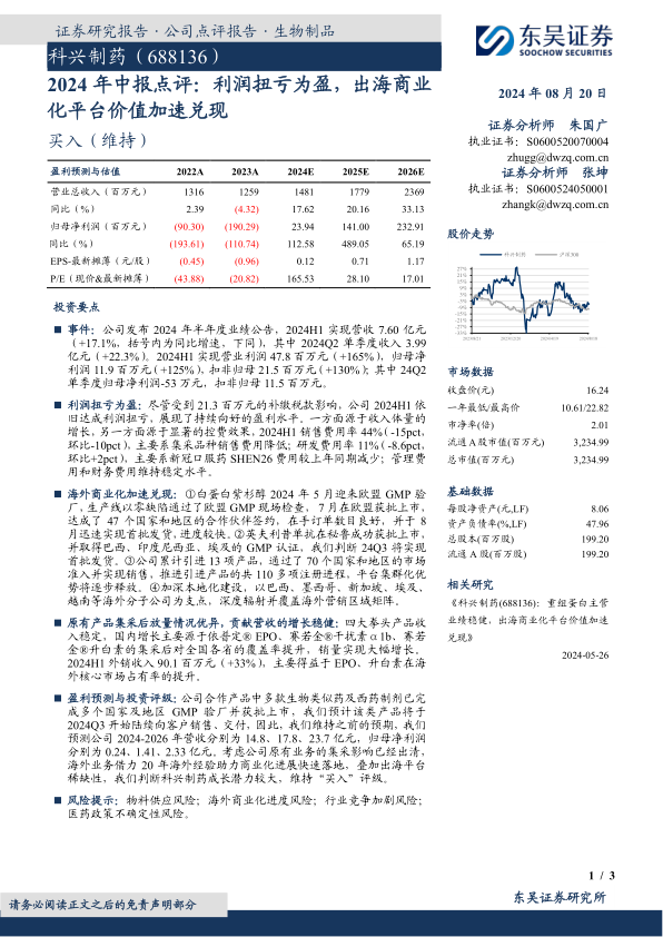 公司合作产品中多款生物类似药及西药制剂已完成多个国家及地区GMP验厂并获批上市,预计该类产品将于2024年第三季度开始陆续向客户销售、交付。因此,维持之前的预期,预测公司2024-2026年营收分别为14.8亿元、17.8亿元、23.7亿元,归母净利润分别为0.24亿元、1.41亿元、2.33亿元。考虑到公司原有业务的集采影响已出清,海外业务借力20年海外经验助力商业化进展快速落地,叠加出海平台稀缺性,判断科兴制药成长潜力较大,维持“买入”评级。