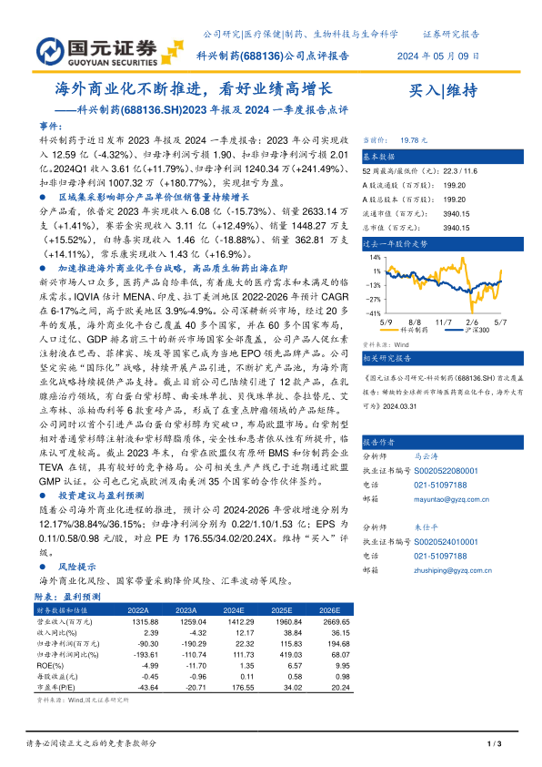 本报告对科兴制药(688136.SH)2023年报及2024年一季度报告进行了深度分析,核心观点如下: