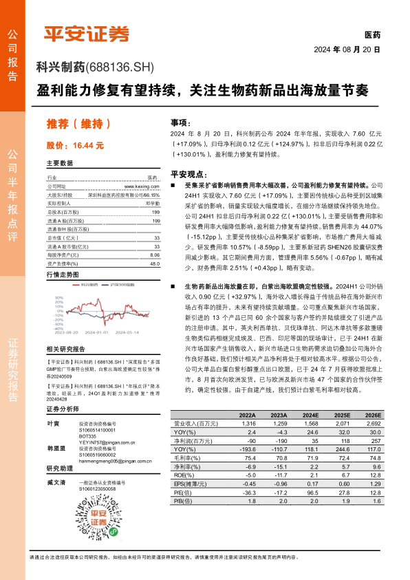 科兴制药2024年半年报显示,公司盈利能力修复明显,主要受益于集采政策影响下销售费用率的降低。同时,公司积极拓展海外市场,生物药新品出海在即,尤其是白蛋白紫杉醇出口欧盟,有望成为新的增长点。维持对科兴制药的“推荐”评级,认为公司在研管线持续推进和海外商业化进程将进一步提升公司估值。但同时也需关注产品研发进度、海外商业化进度以及行业政策变化等风险。