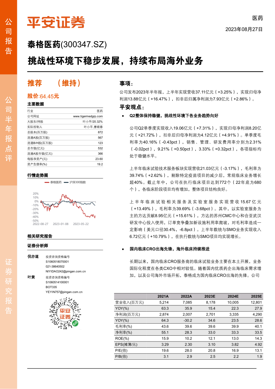本报告分析了泰格医药2023年半年度报告,核心观点如下: