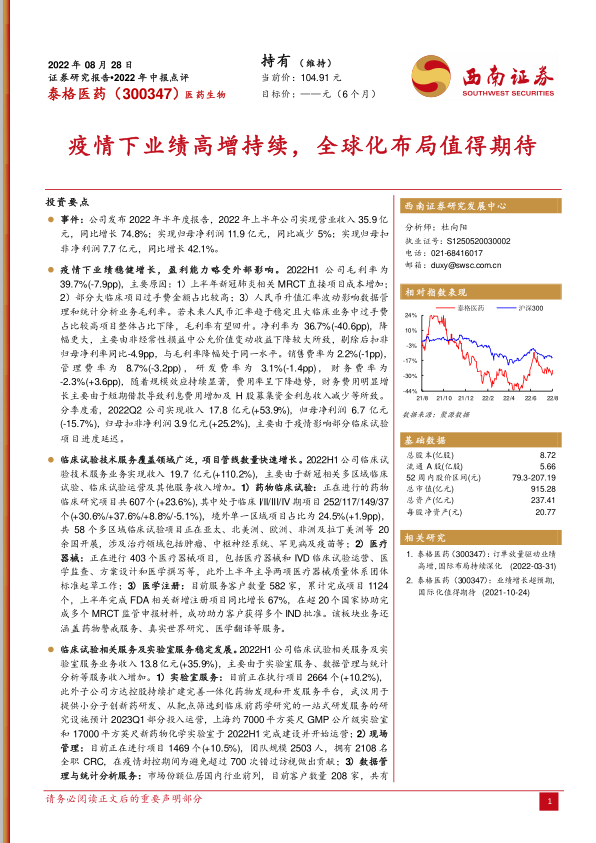 泰格医药2022年中报显示,公司在疫情影响下依然保持了较高的营收增长,但盈利能力受到一些外部因素的影响。临床试验技术服务和相关服务均实现了稳定发展,全球化布局也在稳步推进。维持“持有”评级,但需关注订单波动、产能投运以及业务拓展等风险。