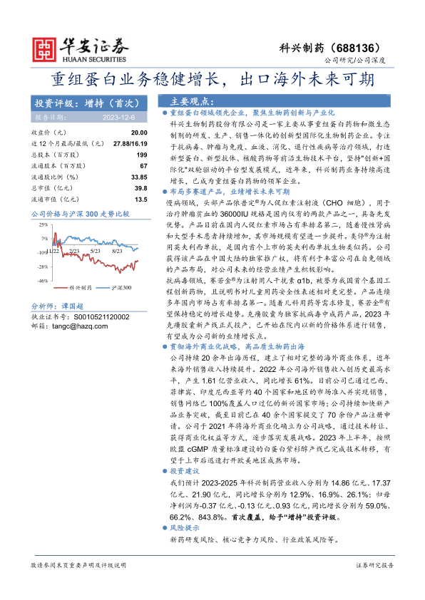 华安证券预计2023-2025年科兴制药营业收入分别为14.86亿元、17.37亿元、21.90亿元,同比增长分别为12.9%、16.9%、26.1%。归母净利润预计分别为-0.37亿元、-0.13亿元、0.93亿元,同比增长分别为59.0%、66.2%、843.8%。其中,依普定®预计未来三年销售增速为5%-8%,赛若金®为8%-20%,白特喜®为5%-25%,常乐康®为10%-15%。海外新产品收入预计在未来三年有大幅增长,尤其2025年海外业绩将显著贡献。基于对公司重组蛋白领域领先地位、多赛道产品布局、以及海外商业化战略的认可,华安证券首次覆盖并给予“增持”投资评级。同时,报告提示了新药研发风险、核心竞争力风险和行业政策风险。