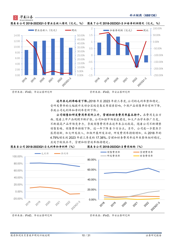 财务方面,公司营收实现稳健增长。2018年至2022年,营业收入从8.91亿元增长至13.16亿元。2023年前三季度,公司实现营业总收入9.69亿元,同比增长2.65%。然而,利润端短期承压,2022年归母净利润为-0.9亿元,同比下降193.59%,主要系研发费用和销售费用同比增加以及非经常性损益减少。2023年前三季度,归母净利润为-0.54亿元,同比上升4.24%,主要得益于内部控费(销售费用率同比下降7.76个百分点,管理费用率同比下降1.15个百分点)以及研发投入的持续加大(研发费用率为17.38%,同比增加4.28个百分点)。毛利率近年来略有下降,但整体稳定。公司持续强化研发创新,2023年前三季度研发投入总额达2.86亿元,占营业收入的比重超过29%,同比增长132%。研发团队中硕士以上学历人才占比提升至53.85%。公司已构建了涵盖药物发现至产业化的完整研发创新体系,拥有原核细胞、真核细胞、微生态活菌三大技术平台。在研管线不断优化,聚乙二醇化人粒细胞刺激因子注射液已完成I期临床试验,人干扰素α1b吸入溶液已完成Ib临床受试者入组给药,多个创新药项目取得重大突破。