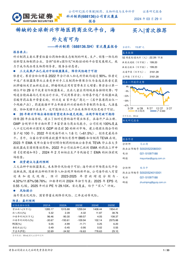 三大品种中标联盟集采,未来降价风险趋于可控;海外新兴市场商业化平台逐渐成熟,随着新品种的不断导入和法规市场的新开拓,公司海外收入有望迎来加速兑现期,预计2023-2025年营收增速分别为-4.32%/11.87%/38.76%;归母净利润2024年扭亏为盈;2025年EPS达0.55元/股,2025年对应PE为29.10X。首次覆盖,给予“买入”评级。