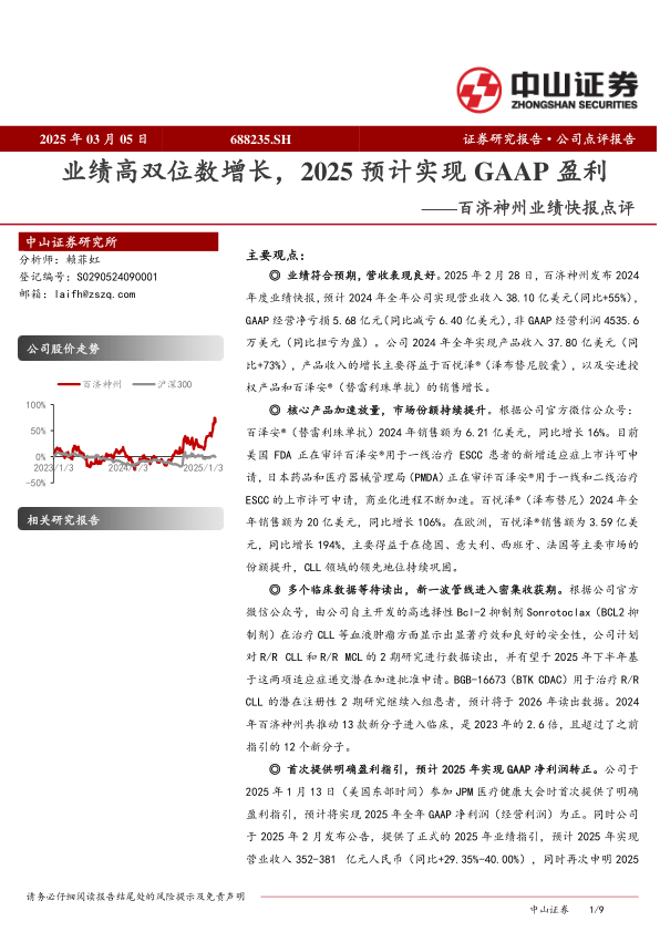百济神州业绩快报点评:业绩高双位数增长,2025预计实现GAAP盈利