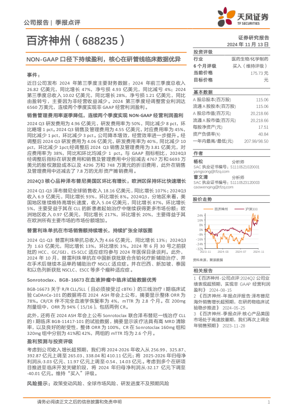 百济神州在2024年第三季度及前三季度表现出强劲的增长势头,总收入同比大幅增长,并在非GAAP口径下实现了连续两个季度的经营利润盈利,净亏损同比显著收窄。这主要得益于核心产品泽布替尼和替雷利珠单抗在全球市场的持续放量和市场份额的快速扩张,特别是泽布替尼在美国市场占据了领先地位,替雷利珠单抗在中国市场通过新适应症获批和高市场渗透率巩固了其竞争优势。同时,公司通过严格的费用控制和运营效率提升,实现了销售、管理和研发费用率的持续下降,降本增效成果显著。此外,在研管线如Sonrotoclax和BGB-16673在血液肿瘤领域取得了优异的临床数据,为公司未来发展注入了新的动力。分析师上调了公司未来收入和部分年份的净利润预测,并维持“买入”评级,反映了市场对公司持续增长和盈利能力改善的积极预期。