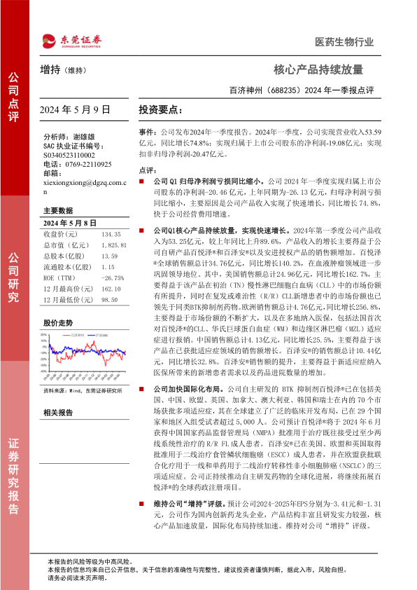 维持公司“增持”评级。预计公司2024-2025年EPS分别为-3.41元和-1.31元,公司作为国内创新药龙头企业,产品结构丰富且研发实力较强,核心产品加速放量,国际化布局持续加速。维持对公司“增持”评级。