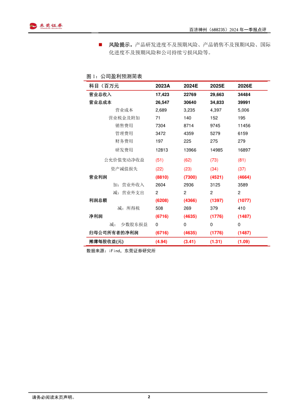 风险提示。产品研发进度不及预期风险、产品销售不及预期风险、国际化进度不及预期风险和公司持续亏损风险等。