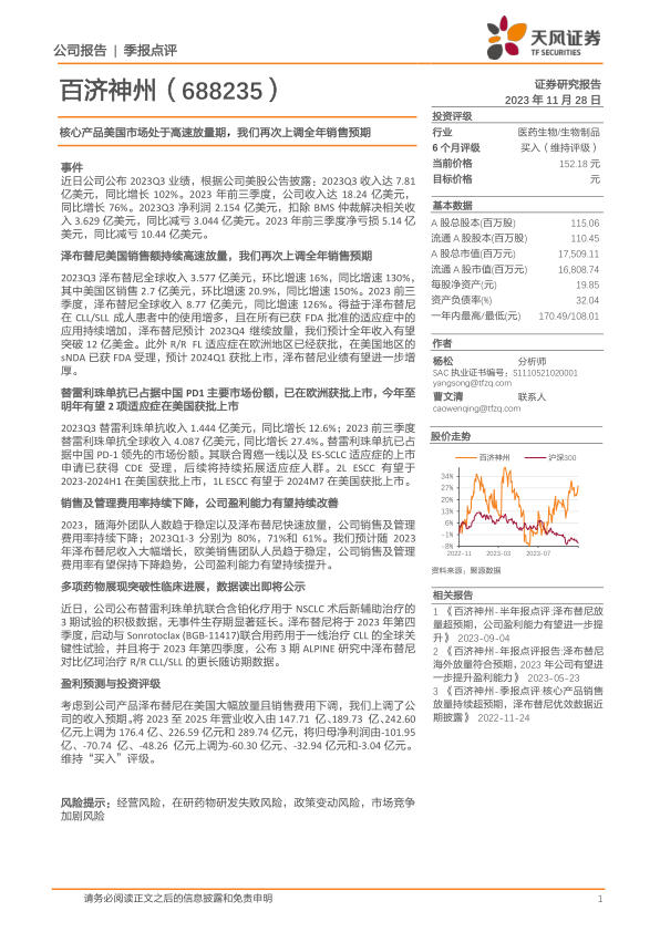 本报告通过对百济神州2023年第三季度业绩的分析,突出了泽布替尼在美国市场的强劲增长势头以及替雷利珠单抗的市场领先地位。公司在研发方面也取得了显著进展,多项药物展现出突破性临床数据。考虑到公司产品在美国的大幅放量和销售费用下调,天风证券上调了公司的收入预期,并维持“买入”评级,认为公司盈利能力有望持续改善。