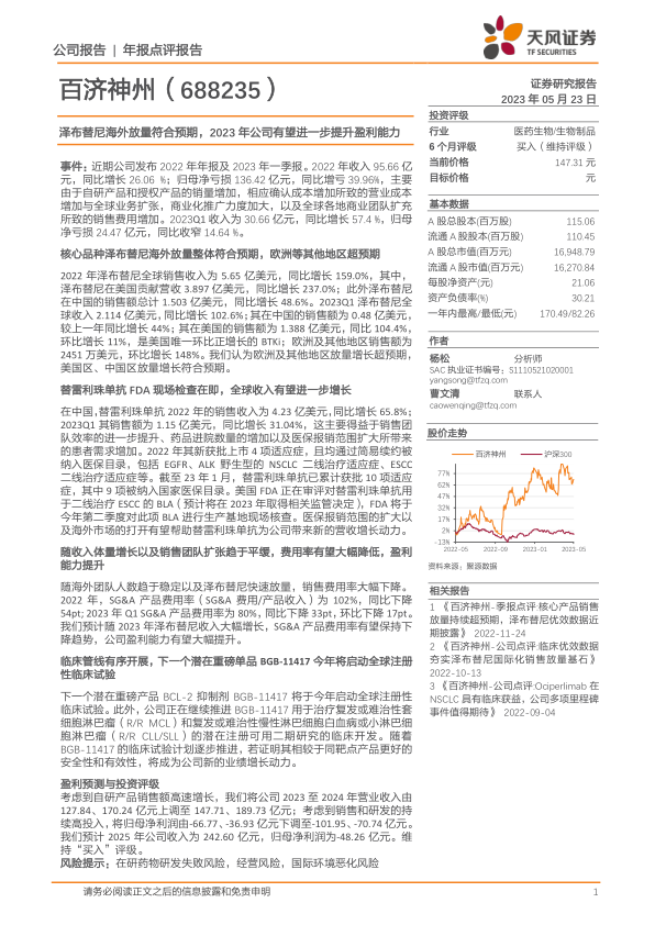 本报告对百济神州2022年年报及2023年一季报进行了分析,核心观点如下: