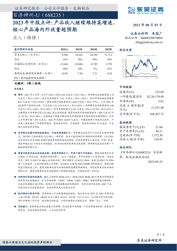 本报告的核心观点是百济神州-U(688235)2023年中报显示出强劲的增长势头,产品收入维持高增速,核心产品如泽布替尼和替雷利珠单抗的国内外市场放量超预期。同时,公司亏损同比收窄,盈利信号开始显现。