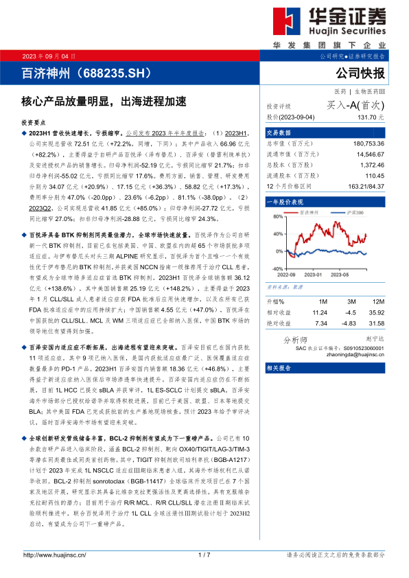 本报告对百济神州进行了深入分析,指出公司2023年上半年业绩表现强劲,核心产品百悦泽和百泽安的销售额显著增长,推动公司整体营收快速提升。同时,公司积极拓展海外市场,与多家国际药企建立战略合作,进一步增强了其全球竞争力。此外,公司在研管线丰富,有望在未来推出更多创新产品,为公司带来新的增长动力。综合来看,百济神州具备强大的创新能力和商业化能力,未来发展潜力巨大,因此给予“买入-A”建议。