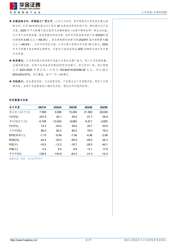 投资建议: 公司具有强大的创新开发能力及商业化推广能力, 核心产品快速放量,出海进程加速, 在研产品具备同类最佳/同类首创潜力, 成长空间广阔。 我们预测公 司 2023-2025 年 营 业 收 入 分 别 为 152.84/216.60/296.26 亿 元 , 同 比 增 长60%/42%/37%。 首次覆盖, 给予“ 买入-A”建议。