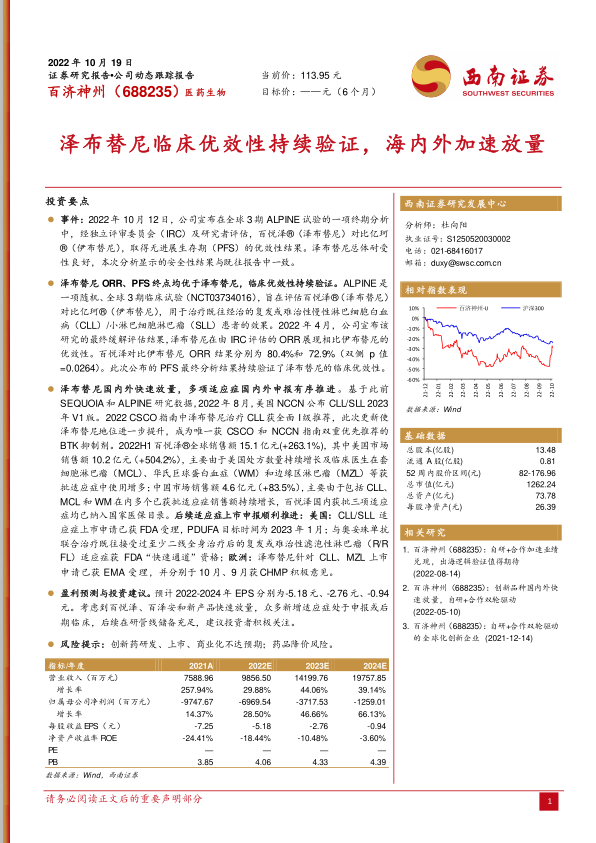 盈利预测与投资建议。预计2022-2024年EPS分别为-5.18元、-2.76元、-0.94元。考虑到百悦泽、百泽安和新产品快速放量,众多新增适应症处于申报或后期临床,后续在研管线储备充足,建议投资者积极关注。