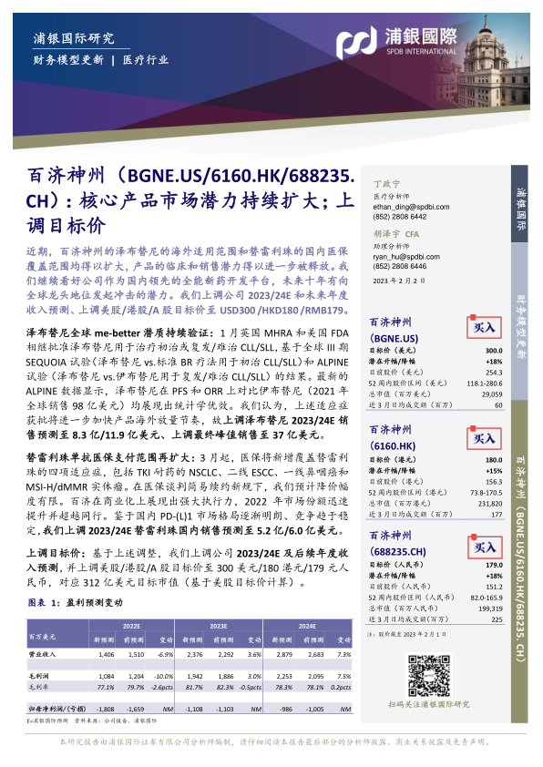 本报告由浦银国际研究发布,对百济神州(BGNE.US/6160.HK/688235.CH)进行了财务模型更新,并上调了其目标价。核心观点如下: