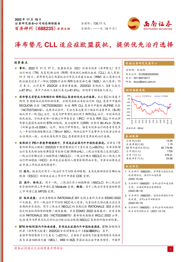 事件:2022 年 11 月 17 日,欧盟委员会(EC )批准百悦泽(泽布替尼)用于治疗初治(TN )或复发/ 难治性(R/R )慢性淋巴细胞白血病(CLL )成人患者;1 1 月 10 日, 泽布替尼在巴西获批治疗华氏巨球蛋白血症(WM)成人患者以及既往接受过至少一种抗 CD20 疗法的 R/R 边缘区淋巴瘤(MZL)成人患者;1 1月 9 日,公司发布 2022Q3 主要财务数据,2022Q3 实现收入 3.9 亿美元(+87.8%),其中产品收入 3.5 亿美元(+81.6%);实现净亏损-5.6 亿美元。