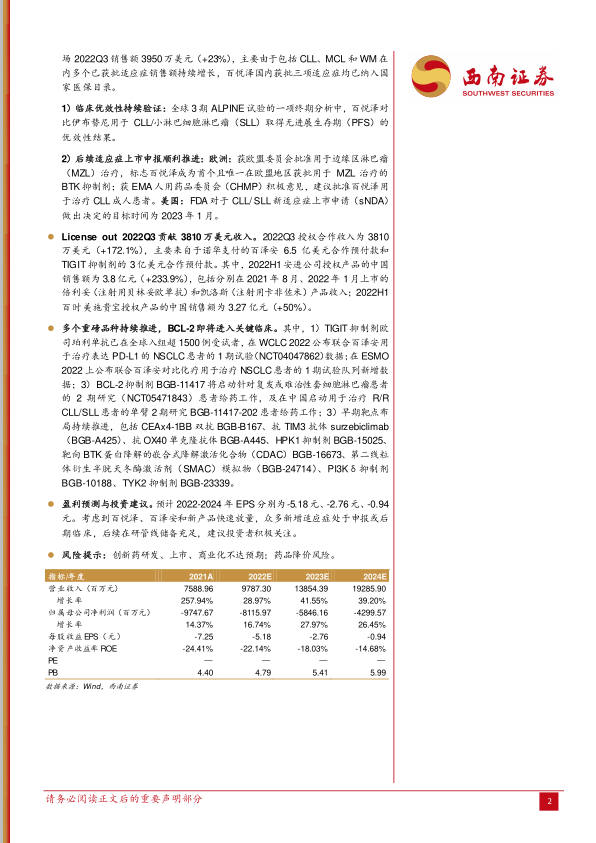 盈利预测与投资建议。 预计 2022-2024 年 EPS 分别为-5.18 元、 -2.76 元、 -0.94元。考虑到百悦泽、百泽安和新产品快速放量,众多新增适应症处于申报或后期临床,后续在研管线储备充足,建议投资者积极关注。