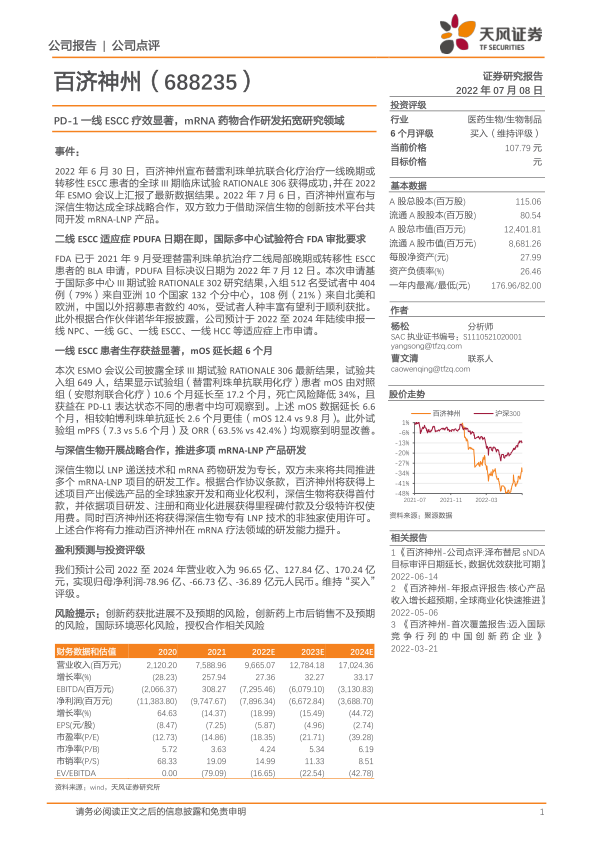 本报告通过对百济神州近期在ESCC治疗和mRNA药物研发领域的进展进行分析,认为替雷利珠单抗在一线ESCC治疗中显示出显著疗效,与深信生物的合作将有助于公司在mRNA疗法领域取得突破。维持对公司“买入”评级,并对公司未来的收入和盈利能力进行了预测。