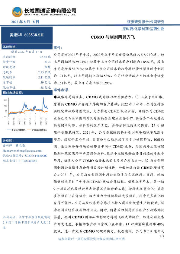 美诺华2022年上半年业绩表现亮眼,营业收入和净利润实现显著增长,主要得益于公司清晰的战略转型和核心业务的协同发展。CDMO业务作为核心增长引擎,通过广泛的客户合作、前瞻性的小核酸平台布局以及与默沙东等国际巨头的战略合作,展现出强大的增长潜力和国际影响力。制剂业务则紧抓国家集采政策机遇,通过成功续标、加速自研及合作品种上市,并积极布局专利到期重磅药物,实现了持续放量和市场份额的扩大。同时,特色原料药业务持续优化客户结构,拓展多品类多市场路线,并严格遵守质量合规,为公司整体发展提供了坚实基础。这些战略举措共同推动了公司业务结构的优化和盈利能力的显著提升。鉴于公司稳步推进的战略转型和各业务板块的强劲发展势头,报告维持“买入”评级,但同时提示了CDMO订单、原料药价格波动及政策合规等潜在风险。