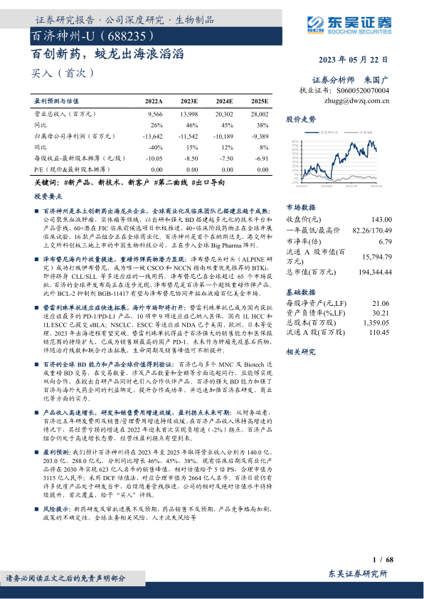 盈利预测: 我们预计百济神州将在 2023 年至 2025 年取得营业收入分别为 140.0 亿、203.0 亿、 288.0 亿元,分别同比增长 46%、 45%、 38%。 现有临床后期及商业化产品将在 2030 年实现 623 亿人名币的销售峰值,相对估值给予 5 倍 PS, 合理市值为3115 亿人民币; 采用 DCF 估值法,对应合理市值为 2664 亿人名币。 百济目前仍有许多优质产品处于研发当中,后续随着管线推进,公司的相对及绝对估值水平将持续提升,首次覆盖,给予“买入” 评级。