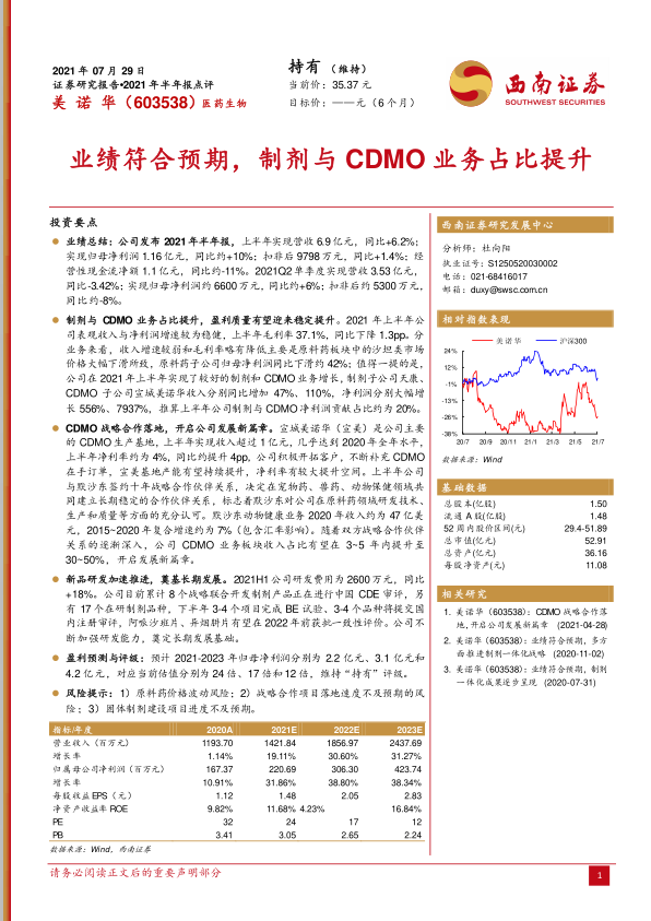 风险提示:1)原料药价格波动风险;2)战略合作项目落地速度不及预期的风险;3)固体制剂建设项目进度不及预期。