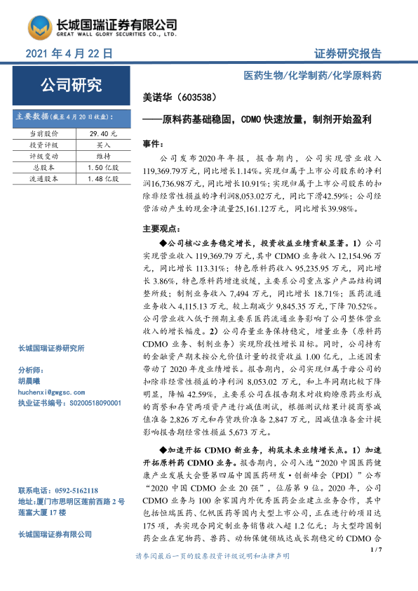 本报告分析了美诺华(603538)2020年年报,核心观点如下: