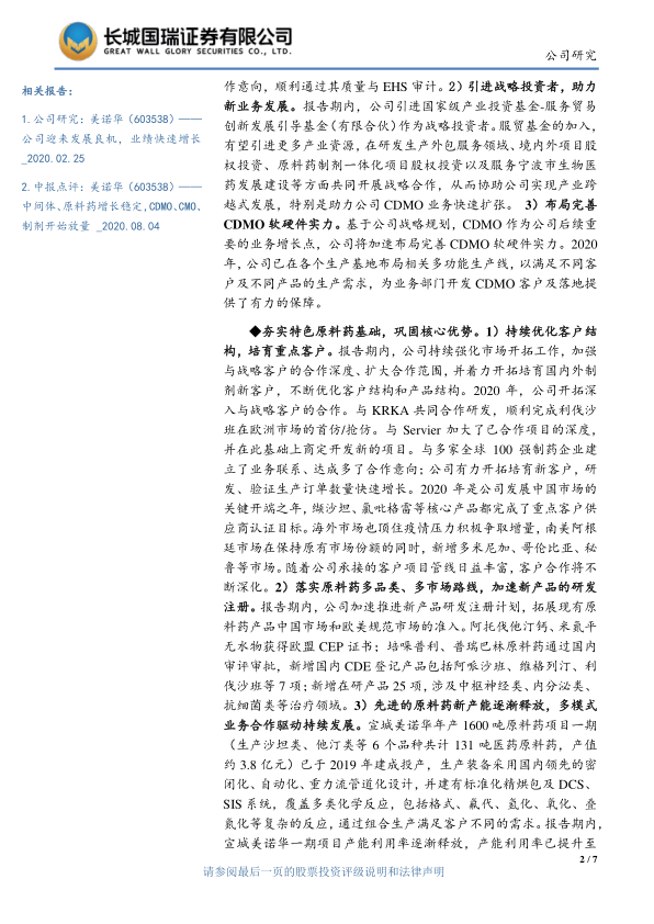 加速开拓 CDMO 新业务,构筑未来业绩增长点。 1)加速开拓原料药 CDMO 业务。 报告期内,公司入选“ 2020 中国医药健康产业发展大会暨第四届中国医药研发·创新峰会( PDI)”公布“ 2020 中国 CDMO 企业 20 强”,位居第 9 位。 2020 年,公司CDMO 业务与 100 余家国内外优秀医药企业建立业务合作,其中包括恒瑞医药、亿帆医药等国内大型上市公司,正在进行的项目达175 项,共实现合同定制业务销售收入超 1.2 亿元;与大型跨国制药企业在宠物药、兽药、动物保健领域达成长期稳定的 CDMO 合作意向,顺利通过其质量与 EHS 审计。 2) 引进战略投资者,助力新业务发展。 报告期内,公司引进国家级产业投资基金-服务贸易创新发展引导基金(有限合伙)作为战略投资者。服贸基金的加入,有望引进更多产业资源,在研发生产外包服务领域、境内外项目股权投资、 原料药制剂一体化项目股权投资以及服务宁波市生物医药发展建设等方面共同开展战略合作,从而协助公司实现产业跨越式发展,特别是助力公司 CDMO 业务快速扩张。 3)布局完善CDMO 软硬件实力。 基于公司战略规划, CDMO 作为公司后续重要的业务增长点,公司将加速布局完善 CDMO 软硬件实力。 2020年,公司已在各个生产基地布局相关多功能生产线,以满足不同客户及不同产品的生产需求,为业务部门开发 CDMO 客户及落地提供了有力的保障。