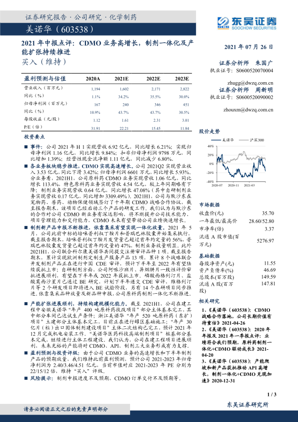 基于CDMO业务的高速增长和下半年制剂产品的预期放量,东吴证券维持美诺华“买入”评级。预计公司2021-2023年归母净利润分别为2.40亿元、3.46亿元和4.51亿元,当前市值对应2021-2023年PE分别为22倍、15倍和12倍。