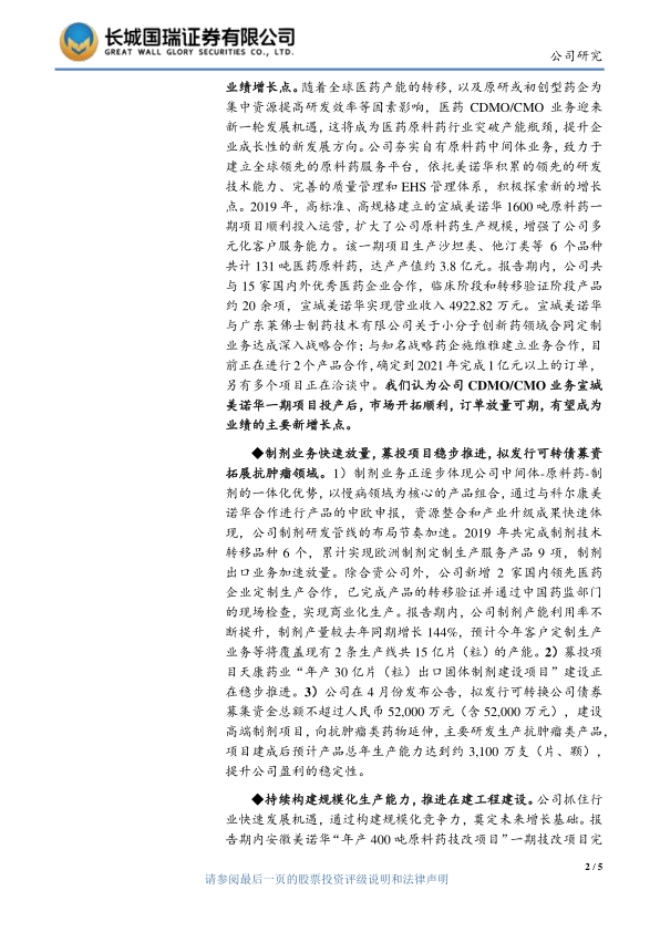 本报告分析了美诺华(603538)2020年中报,指出公司中间体、原料药业务增长稳定,CDMO/CMO和制剂业务开始放量,销售收入稳定增长,合同定制业务贡献显著。基于此,长城国瑞证券将美诺华的投资评级由“增持”上调为“买入”。