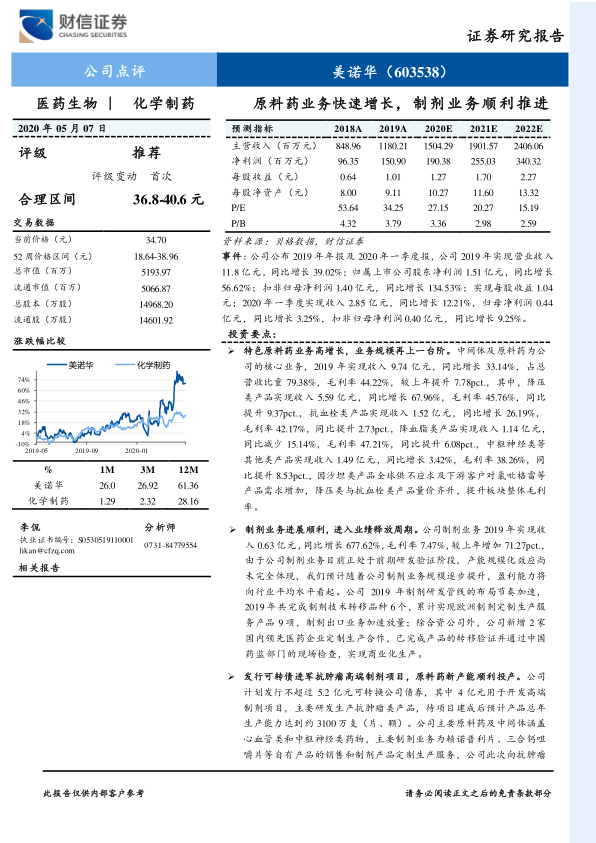 美诺华作为国内特色原料药领域的优质企业,在2019年及2020年一季度实现了显著的业绩增长,主要得益于其核心原料药业务(特别是降压类和抗血栓类产品)的高速发展和毛利率提升。公司制剂业务正逐步进入收获期,并通过发行可转债积极布局抗肿瘤高端制剂市场,以优化产品结构并增强盈利能力。同时,多个原料药新产能项目的顺利推进,将为公司未来的持续增长提供坚实基础。分析师基于对公司未来业绩的乐观预测,给予“推荐”评级,并设定了合理的股价区间。然而,投资者仍需关注产品降价、产能投放和制剂业务进展等潜在风险。