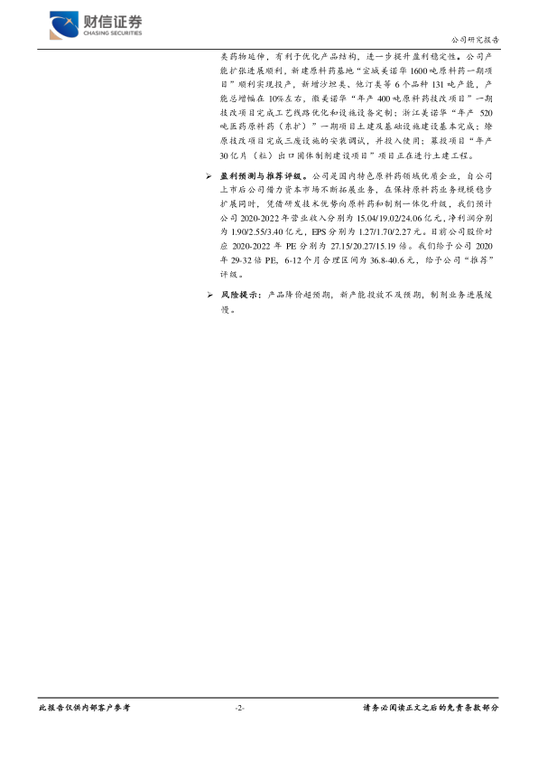 报告提示的主要风险包括产品降价超预期、新产能投放不及预期以及制剂业务进展缓慢。