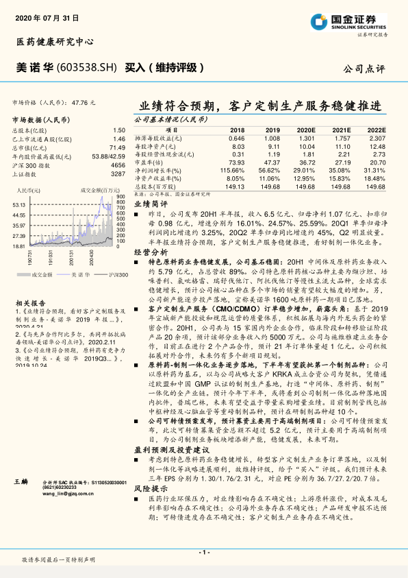 本报告分析了美诺华2020年半年度报告,指出公司业绩符合预期,特色原料药业务稳健发展,客户定制生产服务订单稳步增加,原料药-制剂一体化业务逐步落地。公司发布可转债预案,募资用于高端制剂项目,为未来发展提供动力。维持“买入”评级,但同时也提示了医药行业环保压力、原料涨价、海外业务、产品研发、可转债进度以及客户定制生产业务等风险。