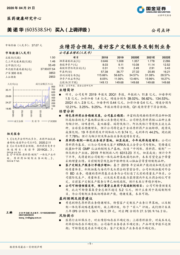 考虑到特色原料药业务的稳健增长、客户定制生产业务订单的落地以及制剂一体化等战略的顺利进展,分析师上调公司评级至“买入”。预计未来三年EPS分别为1.36/1.78/2.29元,对应PE分别为27.3/20.9/16.2倍。