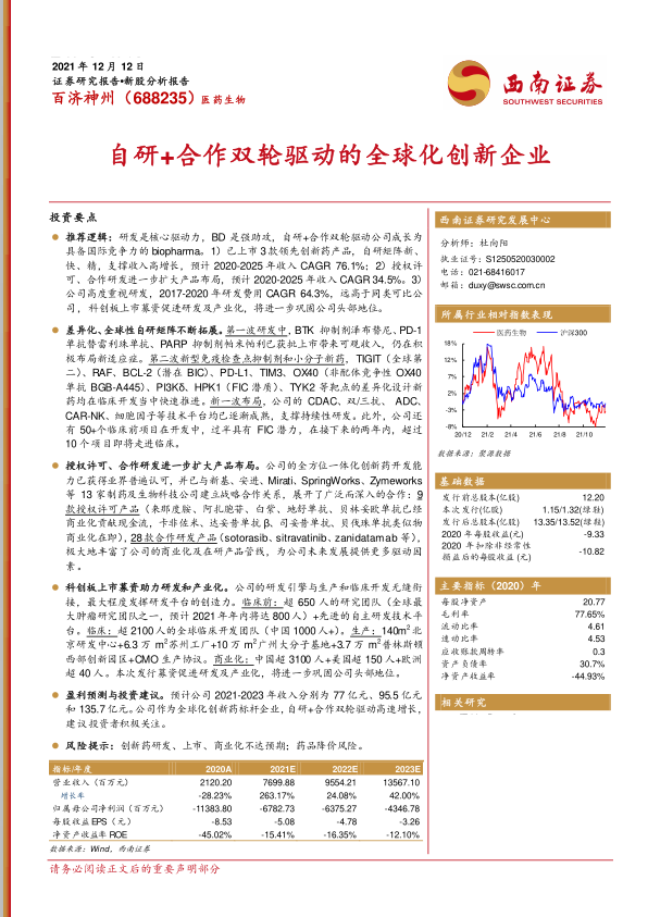 盈利预测与投资建议。预计公司2021-2023年收入分别为77亿元、95.5亿元和135.7亿元。公司作为全球化创新药标杆企业,自研+合作双轮驱动高速增长,建议投资者积极关注。