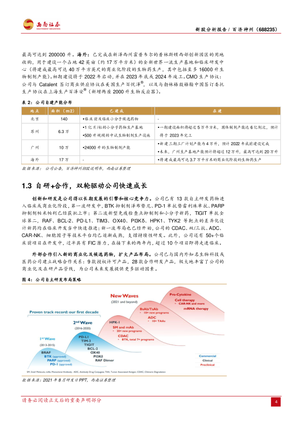 百济神州成立于2010年,是首个实现美股、H股、A股三地上市的创新药企业,已从研发型生物科技公司发展成为具备早期药物发现、临床研究、规模化高质量药物生产和以科学为基础的商业化能力的全方位一体化全球性生物科技公司。公司拥有经验丰富、远见卓识的全球化管理团队,以及强大的研发队伍,包括超过650人的临床前研究团队(预计2021年将达800人)和超过2100人的全球临床开发团队(中国1000人+)。公司在全球超过45个国家和地区执行95项临床试验,其中38项为III期或潜在注册性临床试验,总入组患者及健康受试者超过14000人,海外入组人数接近一半。在生产能力方面,公司在北京、苏州、广州和美国普林斯顿均设有研发中心和生产基地,总产能规划宏大,例如广州大分子基地未来产能预计将超过12万升,最高可达20万升。此外,公司还通过CMO生产协议扩大产能。这种“自研+合作”的双轮驱动模式,结合顶尖的全球化管理和研发团队,以及先进的生产能力,构成了百济神州的核心竞争力,使其能够持续拓展差异化、全球性的自研矩阵,并扩大产品布局。