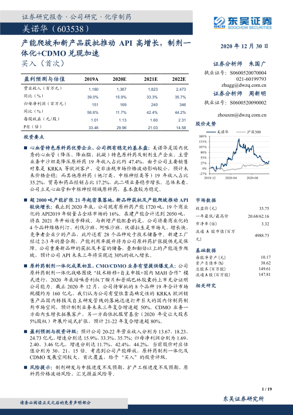 盈利预测与投资评级: 预计公司 20-22 年营业收入分别为 13.67、 18.23、24.73 亿元,增速分别达 15.9%、 33.3%、 35.7%; 归母净利润分别为 1.69、2.40、 3.46 亿元,增速分别达 11.7%、 42.4%、 44.2%,当前股价对应估值分别为 30、 21、 15 倍。考虑到公司产能释放,原料药制剂一体化及CDMO 发展空间较大,首次覆盖,给予“买入”的投资评级。