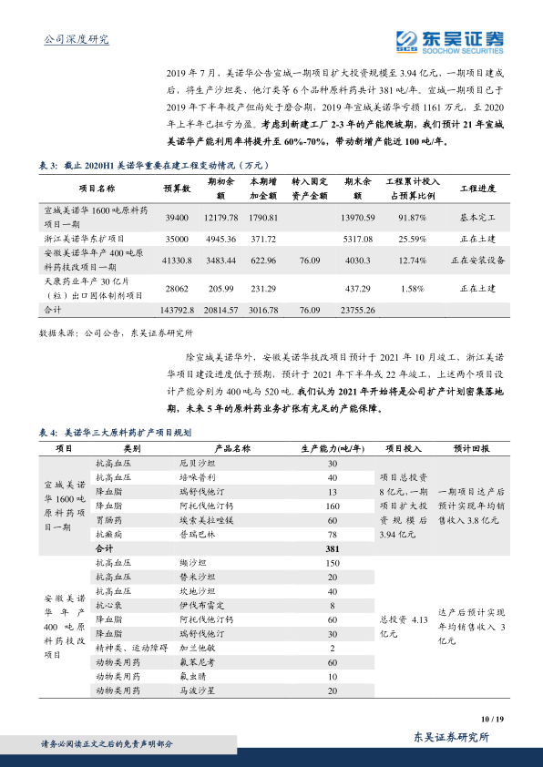 超 2000 吨产能扩张 21 年起密集落地, 新品种获批及产能爬坡推动 API较快增长: 截止到 2020 年底,公司现有原料药产能 1720 吨, 19 个商业化的 API2019 年销量占全球市场的 16%。在建产能合计达到 2050 吨,将在 2021 年开始逐步释放。 与新增产能配套的是, 公司将要商业化的4 个品种维格列汀、利伐沙班、阿哌沙班、伏诺拉生是市场大、增长快、竞争者企业少的产品, 此外还有 28 个品种处于技术储备中。新建工厂经过 2-3 年的磨合期,产能利用率提升将为公司原料药扩张提供充足保障。 公司重要新品种的获批及丰富的储备,叠加翻倍以上的产能逐步爬坡,预计公司 API 未来三年将实现近 30%的收入增长。
