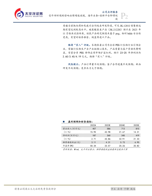 维持“买入”评级。长期来看公司为全球PEG衍生物行业引领企业,掌握衍生物生产全产业链核心技术,产品质量与客户资源优势明显,有望分享PEG修饰应用市场扩容红利。预计23-25年净利润为2.60/3.45/4.19亿元,维持“买入”评级。
