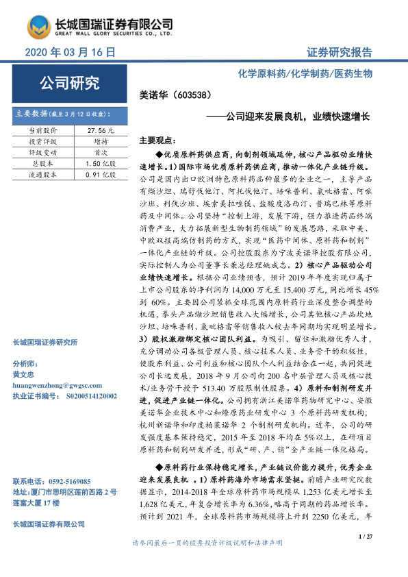 原料药行业稳定增长和产业链议价能力提升,为美诺华带来发展机遇,预计公司未来几年净利润将保持快速增长,具备投资价值。