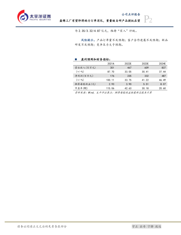 风险提示。产品订单量不及预期;客户合作进展不及预期;新品研发不及预期;竞争压力大于预期。